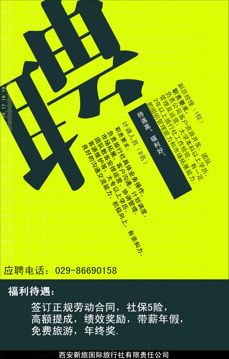 福利待遇:簽訂正規(guī)勞動合同、社保五險、高額提成、績效獎勵、帶薪年假、免費旅游、年終獎。
