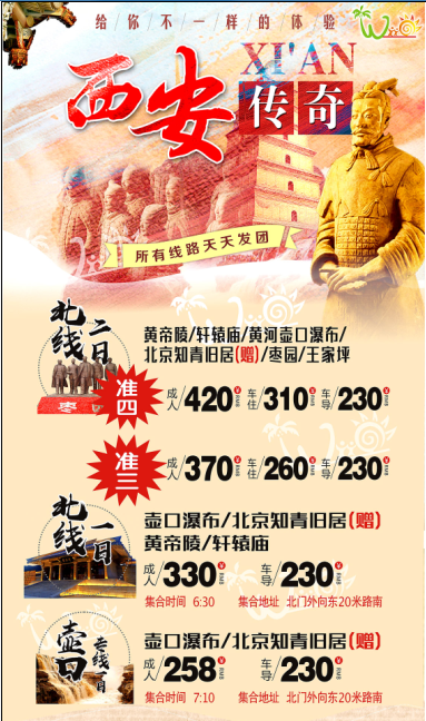 10、立足西安,服務(wù)全國。西安新旅國際旅行社位于西安市中心,本公司憑著良好的信譽、形象、務(wù)實的工作作風(fēng)和靈活的經(jīng)營方式,在競爭激烈的旅游市場中逐步發(fā)展,健康成長,并具有自身經(jīng)營的特色。同樣的價格比質(zhì)量;同樣的質(zhì)量比價格。打造最全旅游產(chǎn)品銷售商,讓游客一站式采購使我們的發(fā)展思路。公司遵循:以質(zhì)量求生存、以創(chuàng)新求發(fā)展、以市場為導(dǎo)向、以服務(wù)為宗旨的經(jīng)營理念,愿為游客提供全方位、多元化、高層次的服務(wù);愿和各界同仁精誠合作,共創(chuàng)美好!
